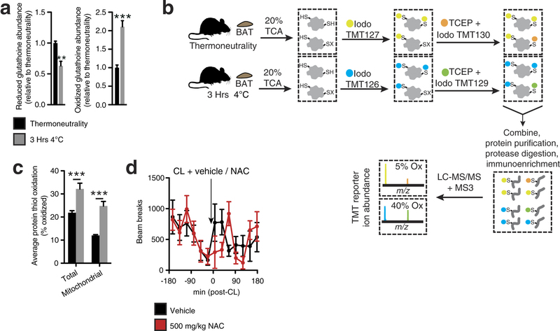 Extended Data Fig. 2: Assessing thiol redox status in vivo and the effect of NAC on movement. a, Mass spectrometric quantification of BAT-reduced and -oxidized glutathione at thermoneutrality and after acute cold exposure (n = 5). b, Scheme for quantitative assessment of protein thiol redox status by ratiometric labelling of BAT protein cysteine thiols. In vivo BAT thiol status is stabilized by protein precipitation in 20% TCA49. Unmodified cysteine thiols are labelled with ‘light’ iodoTMT tags (126, 127, 128). After removal of light iodoTMT, reversibly modified protein thiols are reduced with TCEP in the presence of ‘heavy’ iodoTMT (129, 130, 131). Samples are combined and subjected to trypsin digestion. Ratiometric assessment of iodoTMT labelled peptides provides a quantitative profile of overall protein cysteine thiol redox status. c, Average percentage oxidation status of total BAT and BAT mitochondrial protein thiols at thermoneutrality and after acute cold exposure (n = 3). d, Effect of i.p. NAC on movement as assessed by number of beam breaks (vehicle, n = 11; NAC, n = 7). Data are mean ± s.e.m. of at least three replicates. *P < 0.05, ***P < 0.001 (two-tailed Student’s t-test for pairwise comparisons, one-way ANOVA for multiple comparisons, two-way ANOVA for multiple comparisons involving two independent variables).