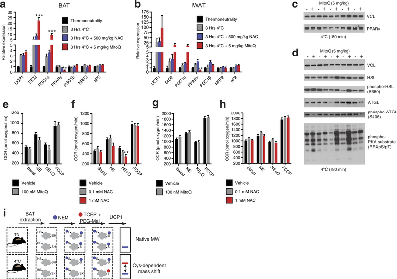 Extended Data Fig. 3: Assessing thermogenic gene expression, adrenergic response parameters, and strategy for determination of UCP1 cysteine thiol redox status. a, b, Quantitative polymerase chain reaction (qPCR) analysis of mRNA expression of selected (a) BAT and (b) inguinal white adipose tissue (iWAT) genes ± cold exposure, ± MitoQ or NAC (n = 5). c, d, Immunoblot analysis of (c) PPAR-γ protein expression levels and (d) lipolytic phosphorylation cascade activation in BAT after cold exposure ± MitoQ. e, f, Raw OCR of primary brown adipocytes under basal conditions and after noradrenaline stimulation + oligomycin to determine leak respiration ± (e) MitoQ (n = 10) or (f) NAC (vehicle and 1 mM NAC, n = 8; 0.1 mM NAC, n = 7). g, h, OCR of primary brown adipocytes lacking UCP1 under basal conditions and after noradrenaline stimulation + oligomycin ± (g) MitoQ (n = 10) and (h) NAC (n = 10). i, Cys-redox mass shift strategy. After in vivo interventions, mouse BAT is excised and unmodified protein thiols are labelled with NEM, after which reversibly oxidized thiols are chemically reduced and labelled with polyethyleneglycol maleimide (PEG-Mal) allowing for determination of cysteine oxidation status on UCP1. Data are mean ± s.e.m. of at least five replicates. *P < 0.05, **P < 0.01 (two-tailed Student’s t-test for pairwise comparisons, one-way ANOVA for multiple comparisons, two-way ANOVA for multiple comparisons involving two independent variables).