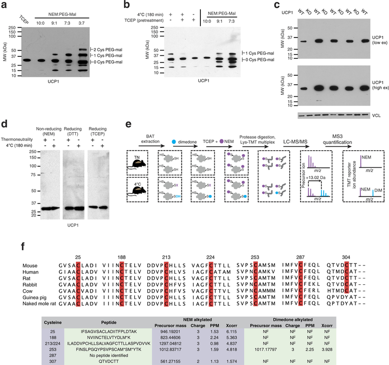 Extended Data Fig. 4: Assessing UCP1 reversible cysteine oxidation status in vivo by immunoblot and mass spectrometry. a, Calibration of UCP1 cysteine gel shift immunoblot. Calibration of cysteine-dependent shifts by incubation of BAT protein with TCEP and different ratios of NEM and PEG-Mal indicates that a single PEG-mal labelling event shifts UCP1 by ~10 kDa above the native molecular mass. b, Calibration of UCP1 cysteine oxidation status indicates that the gel shift observed upon cold exposure (lane 1) is cysteine dependent, as TCEP pretreatment results in a loss of the shift (lane 2). In addition, the cysteine-dependent mass shift is due to a single oxidation event as determined by including the calibrating markers (lanes 4–6). c, Calibration of specificity of UCP1 antibody in BAT. d, Reducing and non-reducing SDS–PAGE analysis of UCP1 to monitor cysteine-dependent and -independent inter-protein interactions during acute cold exposure. e, Scheme for identification of sulfenylated cysteines on UCP1 by dimedone labelling and mass spectrometry. After acute cold exposure, BAT protein thiols are differentially alkylated with dimedone to selectively label sulfenylated thiols and NEM to label non-sulfenylated thiols. Samples are subjected to trypsin digestion, followed by Lys-TMT labelling, and MS quantification of UCP1 cysteine containing peptides in their dimedone and NEM alkylated forms. Two technical points should be noted in this strategy when interpreting relative quantitation of NEM and dimedone-alkylated peptides. First, these differently alkylated peptides may not necessarily ionize with the same efficiency. Second, NEM is reported to react with sulfenic acids albeit less efficiently than with free thiols50, which should be factored in when considering the order of addition of dimedone/NEM and potential underestimation of sulfenylation status. f, Top: amino-acid sequence alignment of UCP1 proteins highlighting the candidate cysteine residues contained within the mouse protein and their level of conservation across various species. Bottom: summary of MS determination of UCP1 cysteine sulfenylation status. Six of seven UCP1 cysteines were identified, with all but one being identified exclusively in the unmodified (NEM-alkylated state). Cys253 is identified as dimedone labelled, indicating that it is a site for sulfenylation.
