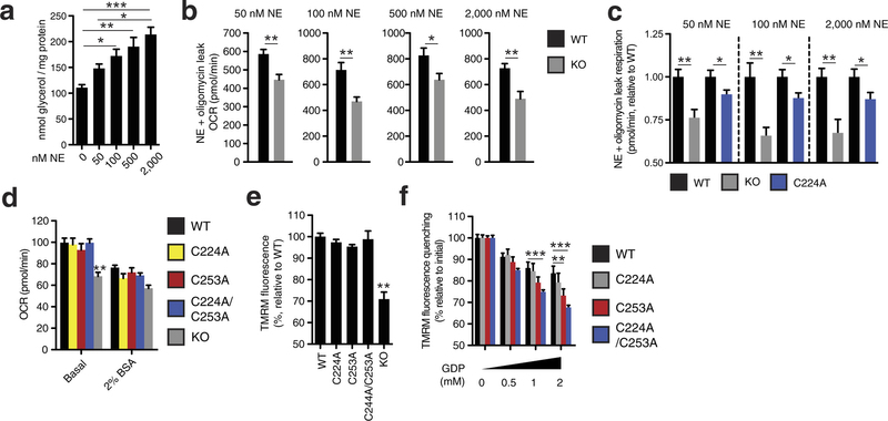 Extended Data Fig. 8: Assessing UCP1-dependent respiration and uncoupling following increasing degrees of adrenergic stimulus. a, Glycerol release from brown adipocytes as an index of adrenergic stimulus and lipolysis in response to increasing concentrations of noradrenaline (n = 4; 0 and 2,000 nM noradrenaline n = 6). b, Representative raw noradrenaline + oligomycin leak OCR values in WT and UCP1−/− brown adipocytes after stimulation with a range of noradrenaline concentrations indicates that UCP1-dependent leak respiration is consistently ~25–35% of total leak OCR (50 nM n = 9; 100 nM n = 7; 500 nM n = 8; 2,000 nM n = 6). c, Assessment of UCP1-dependent leak respiration after stimulation by various concentrations of noradrenaline + oligomycin. Comparison of WT and UCP1−/− OCR (replotted data from Fig. 4 for comparison) indicates that UCP1-dependent respiration is consistently ~25–35% of leak respiration. Comparison of UCP1 WT and C224A indicates that the degree of UCP1 inhibition by C224A is relatively stable across various noradrenaline concentrations (n = 8; C224A 100 nM noradrenaline n = 9, 2,000 nM noradrenaline n = 14). d, Plasma-membrane-permeabilized OCR of brown adipocytes ± endogenous fatty-acid depletion with BSA (WT n = 30; KO n = 20; C224A n = 9; C253A n = 8; C224A/C253A n = 10). e, Comparison of UCP1-dependent uncoupling absent purine nucleotide inhibition in plasma-membrane-permeabilized brown adipocytes (n = 6; C224A/C253A, KO n = 4). f, Comparison of UCP1-dependent uncoupling after titration of GDP in permeabilized adipocytes containing WT UCP1, UCP1 C224A, C253A, and C224A/C253A (n = 6; C224A/C253A n = 12). Data are mean ± s.e.m. of at least four replicates. *P < 0.05, **P < 0.01, ***P < 0.001 (two-tailed Student’s t-test for pairwise comparisons, one-way ANOVA for multiple comparisons).