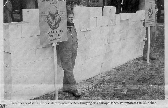 Europäischen Patentamtes in München mit Steinen und Eisblöcken zugemauert. Die Aktion richtete sich gegen ein Patent vom November 2003 auf menschliche