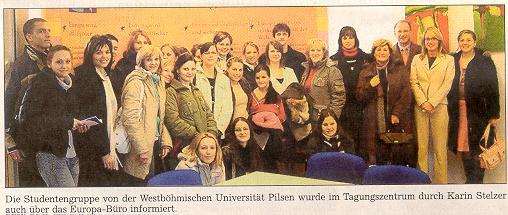 Nach den vielen Informationen wurden die Gäste zum Mittagessen ins Tagungszentrum eingeladen. Doch vorher war es noch ATT-Geschäftsführerin Karin Stelzer, die die Gäste ganz kurz über das Europa-Büro informierte. Sie berichtete, dass im Rahmen der EU-Osterweiterung auch ein Netzwerk mit diesem Europa-Büro geschaffen wurde. Auf Grund der Verfassung wurde eine Ausschreibung für Informationsstellen im ländlichen Raum gemacht. Furth im Wald hatte schon immer den Europagedanken, habe sich beworben und die Zusage für Mai 2005 bekommen. In Deutschland gebe es acht Europabüros, europaweit 400 und in Tschechien sechs. Für den Bürger sei es wichtig, dass er sich mit jeder Frage an das Europabüro wenden könne. Der Bürger müsse sich nur trauen, so Karin Stelzer abschließend.Die Studenten machten sich nach dem Essen mit ihrer Dozentin Dr. Jaroslava Krasova-Unger mit vielen Eindrücken und der Gewissheit auf die Heimreise, vom Raiffeisen-Team hervorragend informiert und betreut worden zu sein.