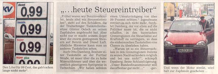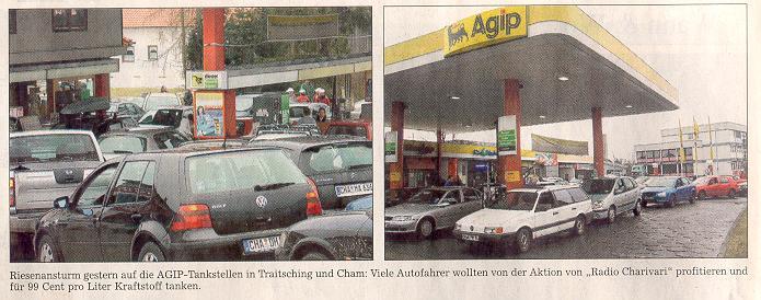 Cham. (ger) "Da sind Leute gekommen, die man sonst das ganze Jahr nicht sieht", bemerkte Günter Oelsch sarkastisch, sein Chamer Kollege Otto Damberg sah es kaum anders: Für jeweils eine Stunde herrschte gestern an den beiden Agip-Tankstellen in Traitsching und Cham Hochbetrieb wie schon lange nicht mehr. Urheber war der Radiosender " Charivari " aus Regensburg, der zum Billigtanken lockte: 99 Cent kostete der Liter, egal welcher Kraftstoff benötigt wurde. Und die Autofahrer kamen in Scharen - vor den Zapfsäulen gab es lange Fahrzeugschlangen. "Es war gigantisch", jubelte Otto Damberg und Günter Oelsch meinte: "Eine Supersache. " Das war es auch für Christian Murauer, der für" Charivari " live von dem Ansturm auf die beiden Tankstellen berichtete.