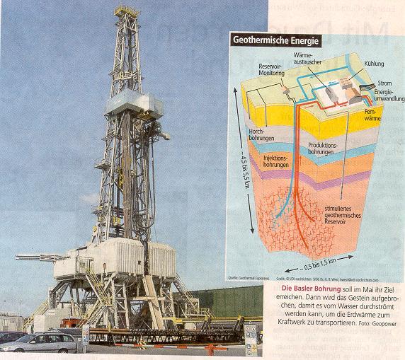 Erdwärme soll Strom und Nutzwärme für Baseler Haushalte liefern. Ob ein Kraftwerk machbar ist, wird in einem Jahr bewertet. Bis dahin zeigen erste Bohrungen, ob das Wasser aus 5000 m Tiefe in genügender Menge und ausreichend heiß zur Verfügung steht. Das Geothermieprojekt Deep Heat Mining in Basel geht in die entscheidende Phase. Anfang Mai wird die Injektionsbohrung bis in 5000 m Tiefe auf dem Gelände der IWB (Industrielle Werke Basel) niedergebracht. In den darauf folgenden Monaten klärt sich, ob das Aufbrechen und Durchspülen von heißem Kristallingestein mit Wasser an der Bohrstelle im Basler Norden technisch möglich und die Energiegewinnung wirtschaftlich ist. Dazu muss die Produktionsbohrung zunächst einmal 200 'C heißes Wasser mit einer erwarteten Schüttung von 75 1/s bringen.