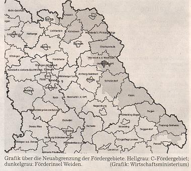 Fördergebiet wird ab 2007 auch die Stadt Weiden sein. Die Förderhöchstsätze liegen bei 15 Prozent für große, 25 Prozent für mittlere und 35 .Prozent für kleine Unternehmen, in den Landkreisen Hof, Wunsiedel und Tischenreuth gelten noch erhöhte Fördersätze von 20, 30 beziehungsweise 40 Prozent, um das Fördergefälle zu den angrenzenden Regionen der Tschechischen Republik zu reduzieren.