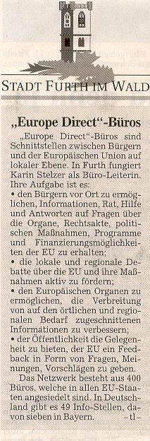 Furth im Wald. (t1) Ein Informationsbüro mit dem Namen "European Direct" wird die Europäische Union demnächst in der Stadt Furth im Wald eröffnen. Das teilte gestern die Stadtverwaltung mit. Der Bürgerservice, der im Tagungszentrum untergebracht wird, soll über die vielfältigen Themen im Zusammenhang mit der Europäischen Union einschließlich der Rechte und Möglichkeiten der EU-Bürger informieren.