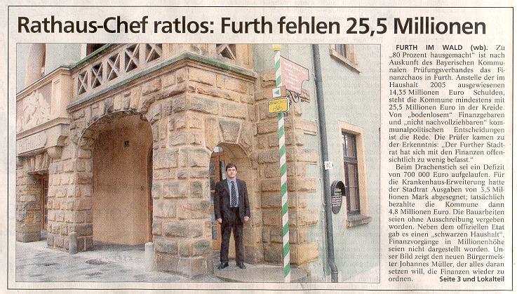 FURTH IM WALD. Rund zehn Millionen Euro mehr Schulden als im Haushaltsplan 2005 ausgewiesen und eine "bodenlose" Finanzpolitik mit einem "schwarzen Haushalt": Zu dieser Erkenntnis kamen die Mitarbeiter des Bayerischen Kommunalen Prüfungsverbandes bei der Vorstellung des Prüfungsberichts der Haushaltsjahre 1999 bis 2004 der Stadt Furth im Wald. in einer öffentlichen Stadtratssitzung erläuterten die Finanzexperten den rund 80 Seiten umfassenden Bericht und präsentierten ein niederschmetterndes Ergebnis. "Ich bin schon viel gewohnt, aber das, was hier in Furth geschehen ist, ist bodenlos", brachte es Prüfer Johann Rohrmüller auf den Punkt. Rund 300 Bürger waren zu der Sitzung gekommen, die deshalb ins Further Tagungszentrum verlegt werden musste.