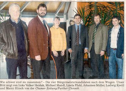 Michael Mandl: Was mir an den Wahlkämpfen und Initiativen der Mitkandidaten gefällt? Es war von Anfang an klar, dass alle Kandidaten inhaltlich nahezu ähnliche Aussagen machen würden, weil die brennenden Themen ja in der Luft liegen. Deswegen will ich jeweils einen interessanten Aspekt der Mitkandidaten herausheben: Bei Volker Heiduk ist die Homepage der Freien Wähler interessant, wenngleich man dort selber Probleme mit der Abstimmung zugibt. Bei Ludwig Kreitl war ich überrascht, dass er den Stil von Bürgermeister Macho gegenüber den Rathausbediensteten kritisiert und sich sogar vom Further Ehrenbürger Edmund Stoiber distanziert hat. Die Bewerbung von Johannes Müller zeigt ehrlich auf, dass innerhalb der CSU nicht nur in Bayern, sondern auch im Ortsverein Furth im Wald Diskussionsbedarf besteht und die CSU keineswegs so einig ist, wie nach außen getan wird.