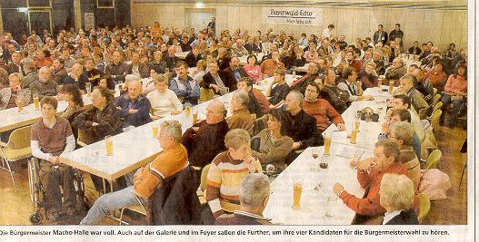 FURTH (si). Die Bürgermeister-Macho-Halle erwies sich für die vier potenziellen Nachfolger als zu klein. Mehrere hundert Further wollten die Vorstellung der Kandidaten für die Bürgermeister-Wahl miterleben.