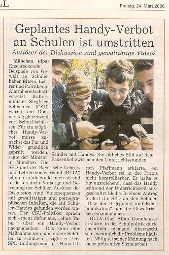Nicht anders ist es an allen anderen Schulen. Ob dies noch verschärft wird, bleibt abzuwarten, nachdem Bayerns Kultusminister Siegfried Schneider angekündigt hat, dass er ein generelles Handyverbot an den Schulen prüfen lässt. Die von uns befragten Schulleiter halten aber nichts davon. "Wer soll das kontrollieren", fragen etwa Rudolf Reinhardt und Gerhard Pschorn, die Chefs der beiden Gymnasien. "Da müsste man ja jeden Tag die Schultaschen durchsuchen", meint Reinhardt skeptisch. Für viel wichtiger findet er, mit den Schülern über die Problematik solcher Daten auf Handys zu diskutieren. "Und das wird im Unterricht gemacht, wie überhaupt des Thema Gewalt immer wieder erörtert wird."