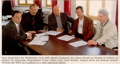 Josef Höcherl, Vorsitzender der WBV Waldmünchen und Vorsitzender der Forstwirtschaftlichen Vereinigung Oberpfalz, hatte Sackmann um Unterstützung gebeten, weil er befürchtet hatte, dass das Geld, das zur Verfügung gestellt werden sollte, für die WBVs nicht ausreicht. Mit der jetzigen Regelung zeigten sich Höcherl und seine Kollegen von den WBVs im Landkreis zufrieden.