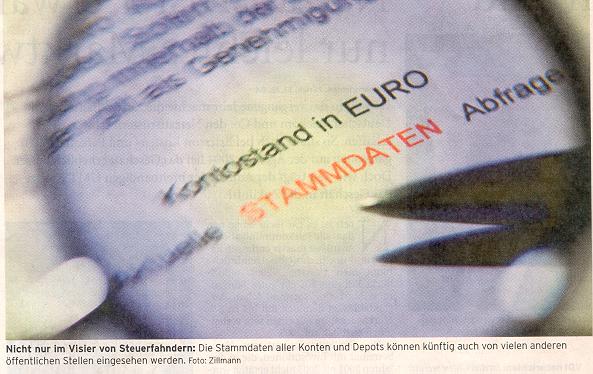 Mit dem "Gesetz zur Förderung der Steuerehrlichkeit" können Finanzbehörden und andere öffentliche Stellen, die in Deutschland für Leistungsvergaben zuständig sind, über das Bundesamt für Finanzen ab 1. April nächsten Jahres Informationen über die Konten aller Bankkunden erhalten. Die Auskunft erstreckt sich zwar nicht auf die Kontostände. Auf Grund der durch den Abruf erlangten Erkenntnisse können jedoch - in einem zweiten Schritt - weitere Überprüfungen dann auch im Hinblick auf die Guthaben direkt beim Kreditinstitut erfolgen. PS_________________________________________________________________________________________