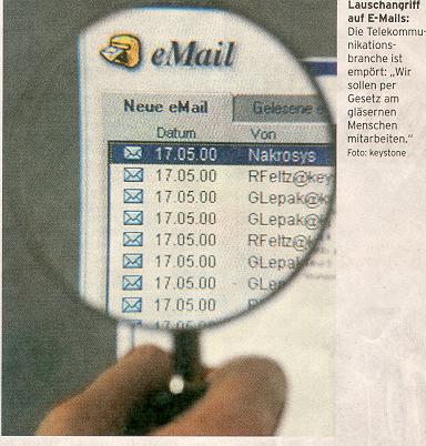 Das Beispiel könnte Schule machen. Die Providerbranche stöhnt angesichts des Starttermins für die E-Mail-Überwachung gemäß der Telekommunikations-Überwachungsverordnung (TKÜV) am 1.1.2005. Während große Telekommunikationsfirmen gerade dabei sind, ihre Anlagen mit enormen Aufwand abhörgerecht zu machen, beschäftigen sich viele kleine Internetanbieter erst jetzt mit den nach dem 11. 9. 2001 verabschiedeten Auflagen. Dabei geraten sie teils in Existenzangst. Schießlich rechnet der Verband der deutschen Internetanbieter eco mit Einstiegskosten für die Abhörtechnik von"20 000 E an aufwärts".