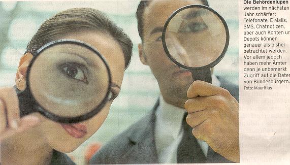 Telefonkunden und Internetnutzer geraten zunehmend ins Visier der Terrorfahnder. Ab 2005 stärker denn je. Zudem erlaubt das neue "Gesetz zur Förderung der Steuerehrlichkeit" vielen Behörden tiefe, unbemerkte Einsichtnahmen.