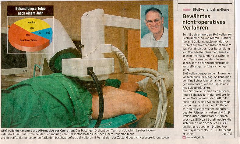 Seit etwa fünf Jahren lässt eine andere und umwälzende Variante dieser Technik die Fachwelt aufhorchen. Ein Arbeitsteam um den Hattinger Orthopäden Hans-Joachim Lauber und Jörn Ludwig aus Bochum hat begonnen die hochenergetischen Stoßwellen zur Behandlung der bislang unheilbaren Hüftkopfnekrose einzusetzen. Das auch als "Knocheninfarkt" bezeichnete Leiden ist eine schmerzhafte auf Röntgenbildern im Frühstadium nicht erkennbare Erkrankung.