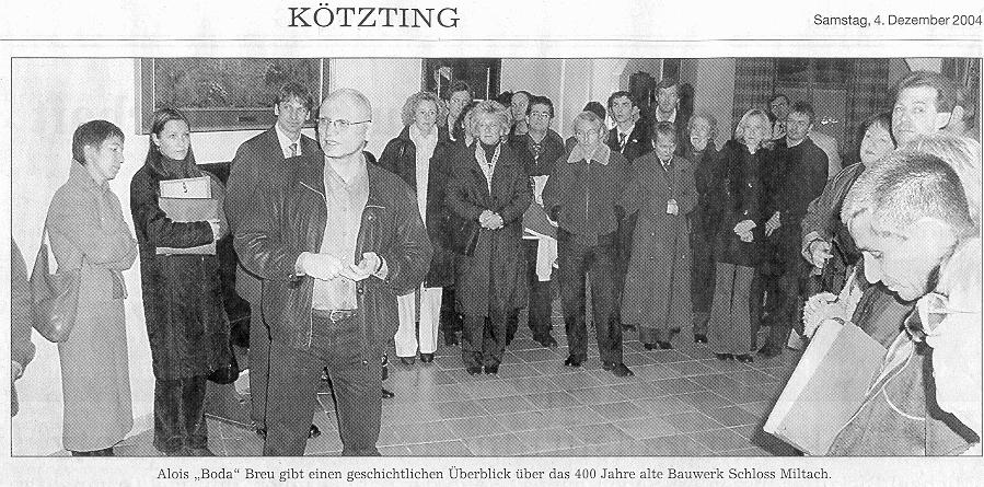 Auch im Namen des Landrats Theo Zellher begrüßte Klaus Schedlbauer vom Arbeitskreis Regionalmarketing die Botschafter des Landkreises. Erfreulich sei das Interesse der Teilnehmer, etwas Neues kennen zu lernen. Seinen Gruß richtete der Sprecher an Miltachs Bürgermeister-Stellvertreter Martin Nemmer und an den Künstler Alexander Costa. Alois Breu führte in den oberen Gebäudetrakt; in amüsanter Weise erzählte er über die Vorbesitzer dieses Schlosses, vom Erbauer Justinian Peilnstein bis zur letzten Besitzerfamilie Oertel. "Das Schloss ist ungefähr 400 Jahre alt; es fand eine Schlosserweiterung von neun auf 13 Fensterachsen statt, in dieser Größe präsentiert es sich. Fritz und Franziska Schleyerbach haben das sehr heruntergekommene Schloss aufwendig restauriert, wir sind sehr bemüht, es zu erhalten. Wie man dies auf die Reihe bekommt, ist nicht ganz einfach," so Alois Breu. Freude bereitete der kürzlich verliehene Kulturpreis, dies sei auch eine Bestätigung des Bemühens um klassische Konzerte und Ausstellungen.