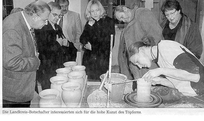 In der Schlosstöpferei machte Kleindorfer-Marx deutlich, wie das Handwerk die Gegend im Landkreis Cham prägte und damals Schulen für die Handwerker entstanden. Für das Töpfer-Handwerk sei Liebe zum Beruf und viel Erfahrung erforderlich, wie Christiane Schleyerbach-Breu ausführte. Während ihrer Erklärungen über die einzelnen Arbeitsvorgänge konnten die Besucher Eva zusehen, die an der Töpferscheibe einen Krug formte. In der "Brandkammer" erfuhren die Gäste die weiteren Schritte über das Glasieren, Bemalen und Brennen bis zum verkaufsfertigen Artikel. Die letzte Station war der "Jazzkeller", hier erwartete die Botschafter eine besondere Attraktion, der Auftritt der "Nordlichter" Klaus Ignatzek und Florian Poser. Die Musikfreunde waren begeistert. Klaus Schedlbauer bedankte sich bei Christiane Schleyerbach-Breu und Alois Breu mit dem Buch" Oberpfälzer Burgen" und einem gerahmten Bild, das Vorder- und Rückseite einer alten Miltacher Bürgermeister-Medaille zeigt. Bärbel Kleindorfer-Marx wusste es zu schätzen, dass hier "im besten Musikkeller von Miltach" ein gutes Programm steht, wo sich Jazz-Größen treffen. Diese Termine werden im Kulturkalender des Landkreises veröffentlicht; der Kulturverein arbeite auch mit dem Landratsamt zusammen.