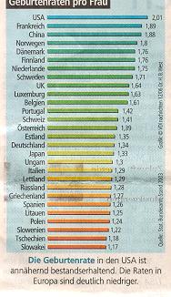 Im Jahr 2004 brachte jede Frau in Deutschland 1,37 Kinder zur Welt. Um den Bevölkerungsstand zu halten, wären 2,1 Kinder pro Frau nötig. Diese Quote ist sehr niedrig, aber sie ist nicht, wie oft behauptet, die niedrigste der Welt. Und sie war auch in Deutschland schon niedriger: Mitte der 80er Jahre lag sie in der damaligen Bundesrepublik noch knapp darunter.