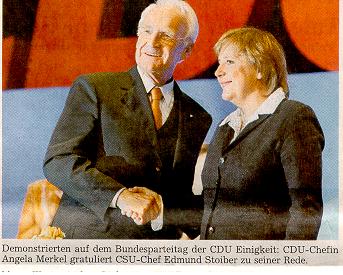 In seinem mit freundlichem Beifall bedachten Grußwort forderte Stoiber mehr Gemeinsinn und Vaterlandsliebe als Triebfeder für Reformen. "Unser Land braucht wieder mehr inneren Zusammenhalt, damit wir gemeinsam aus der Krise herauskommen", rief er. Der Bundesregierung bescheinigte der bayerische Ministerpräsident ebenso wie Merkel und CDU-Generalsekretär Laurenz Meyer eine "verheerende" Bilanz: Deutschland sei in sechs Jahren "ärmer und kälter geworden".
