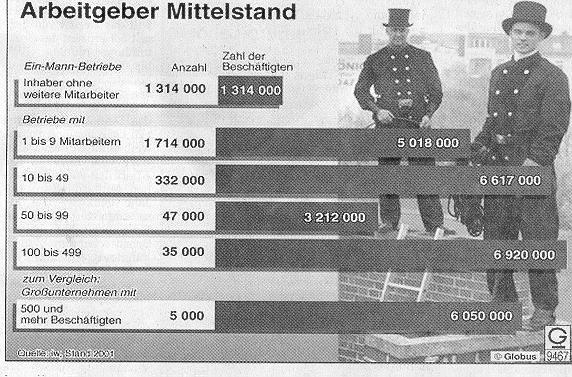 Wie KfW-Chef Hans Reich sagte, entstehen neue Jobs vor allem bei investierenden Mittelständlern. In diesen Betrieben wachse die Beschäftigung um etwa 3,5 Prozentpunkte stärker als in Firmen, die nicht investieren, heißt es im "Mittelstandspanel 2004", für das rund 15000 Betriebe mit weniger als 500 Millionen Euro Jahresumsatz befragt wurden. Danach investierten kleinere und mittlere Firmen im vergangenen Jahr 190 Milliarden Euro, 2002 waren es noch mehr als 200 Milliarden Euro.
