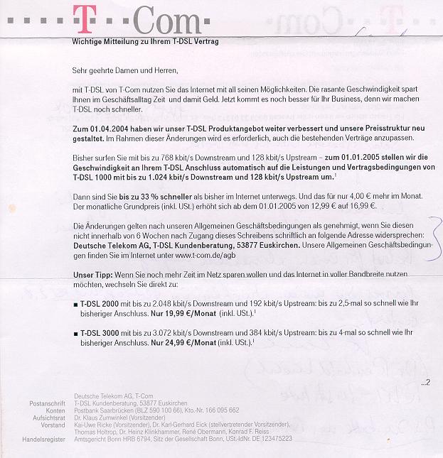 Zwangs-Erhöhung der Gebühren durch T-Com um fast 30 % unter dem Vorwand, es gäbe ein neues besseres Produkt! Anstatt einer Sekunde dauert es nun 0.8 Sekunden bis die Homepage aufgebaut ist, etc.!! Man bekommt das bisherige Produkt nicht mehr und muß die neuen Bedingungen akzeptieren oder man bekommt den Vertrag gekündigt! Nach schriftlichem Widerspruch wurde dieses mitgeteilt.