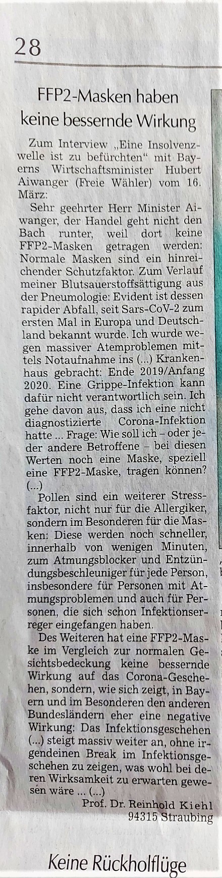 | Betreff: | Leserbrief zu FFP2-Masken, Str.Rundschau, 14.Jan. und weitere, "FFP-Maske nicht das beste Werkzeug für Laien", 25.Jan. , plus... "Eine Insolvenzwelle ist zu befürchten", 16.März, Str.Tagblatt, Politik, S.5 |