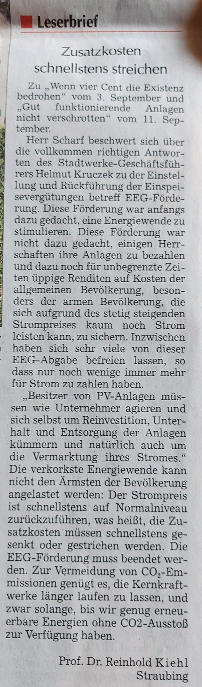 Betreff: Leserbrief zu "Wenn vier Cent die Existenz bedrohen", 3. Sept., S.23. und Antwort "Gut funktionierende Anlagen nicht verschrotten", Str.Rundschau, 11.Sept., S.25