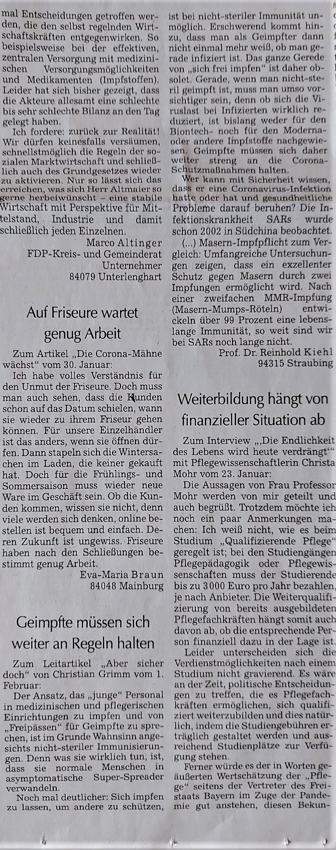 | Betreff: | Impfen - Langzeitfolgen, Leserbrief zu "Wirrwarr um Corona-Schutz" und weitere Artikel, Str.Rundschau, 26. Jan., S. 21, "Privilegien für Geimpfte", Str.Tagblatt, 01.02.29021 |